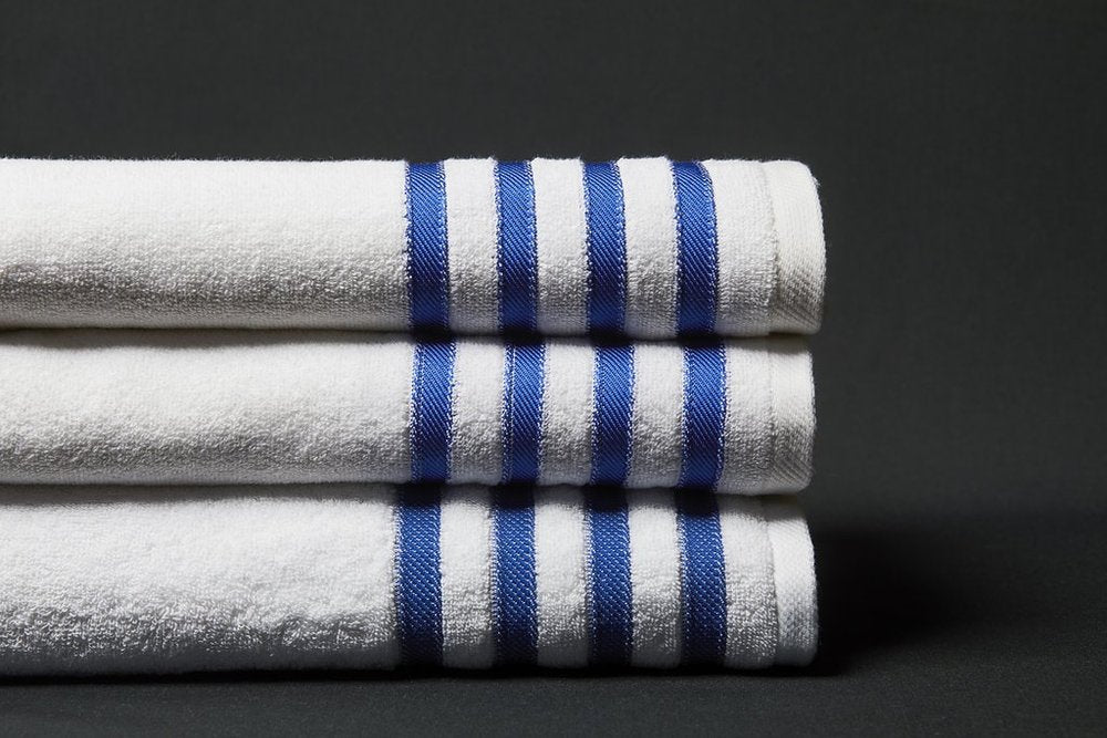 Blanco con 4 rayas en un extremo, colores disponibles en azul y gris.